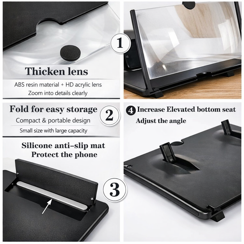 Built with a stable phone holder, anti-slip silicone pad, and adjustable support stand, the magnifier keeps your device secure while providing a comfortable viewing angle.