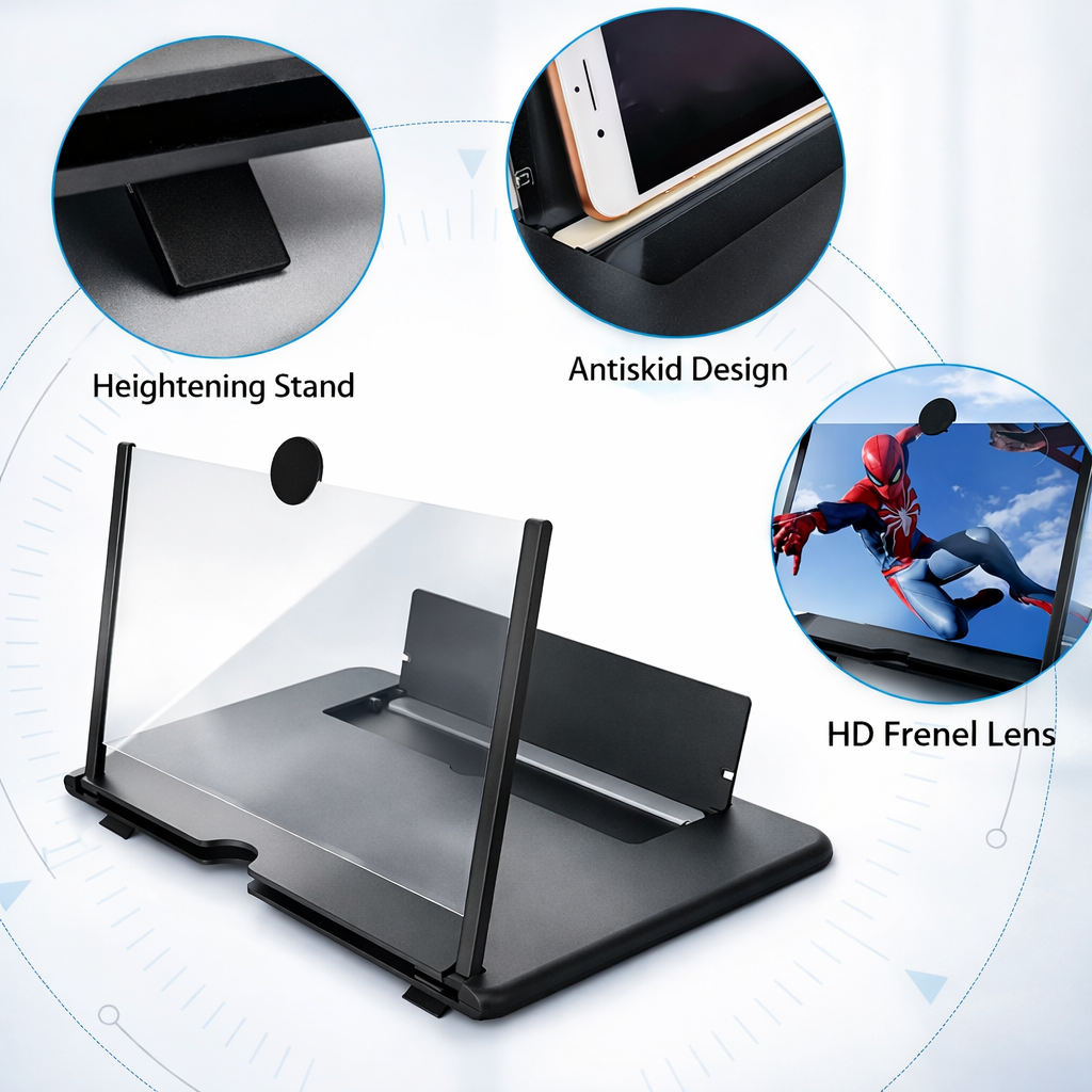 Enjoy a more comfortable and immersive viewing experience with this hands-free phone screen magnifier and stand. Designed to enlarge your smartphone display, this device makes watching movies, videos, reading, or browsing easier on your eyes while keeping your hands free.